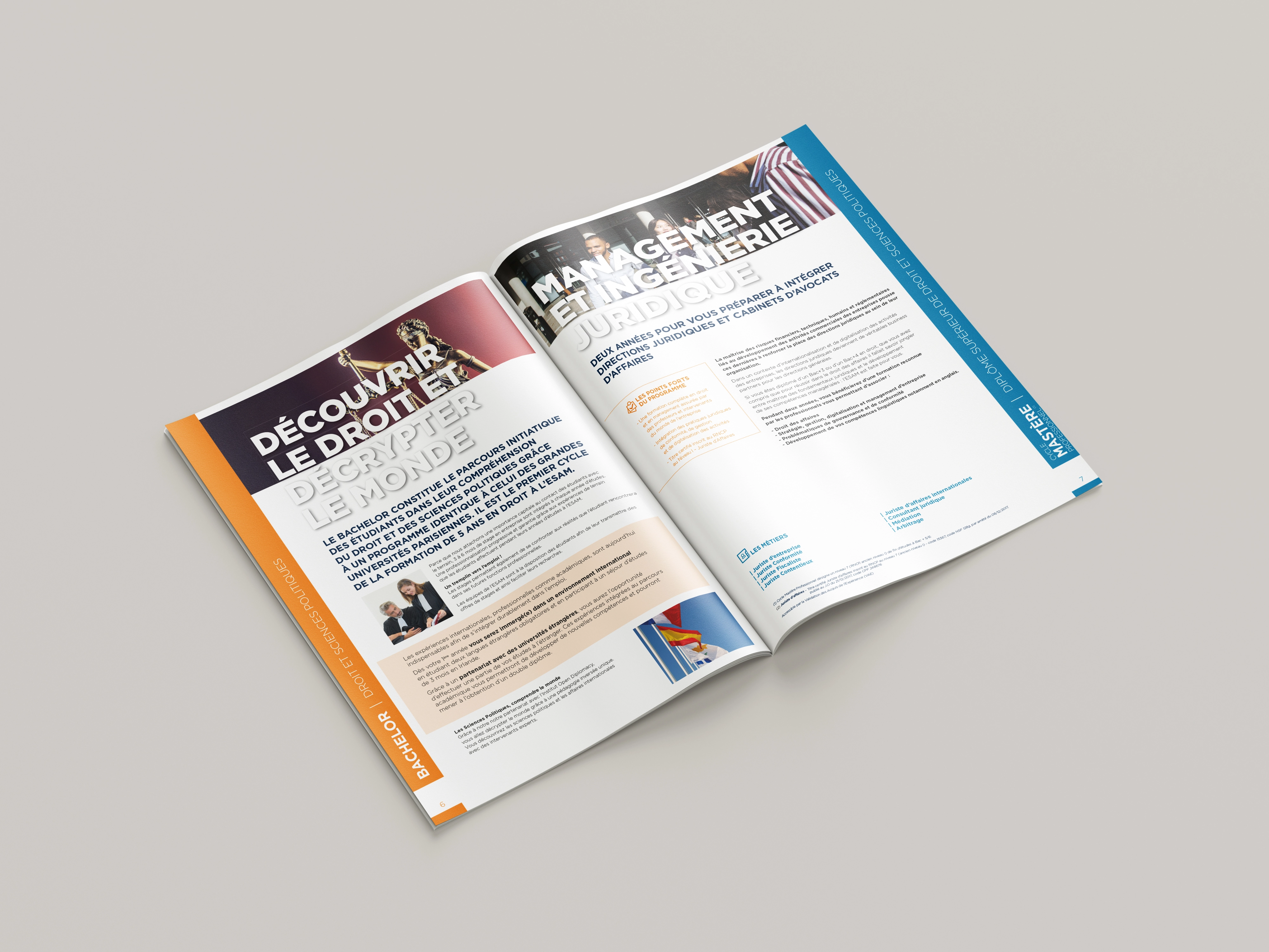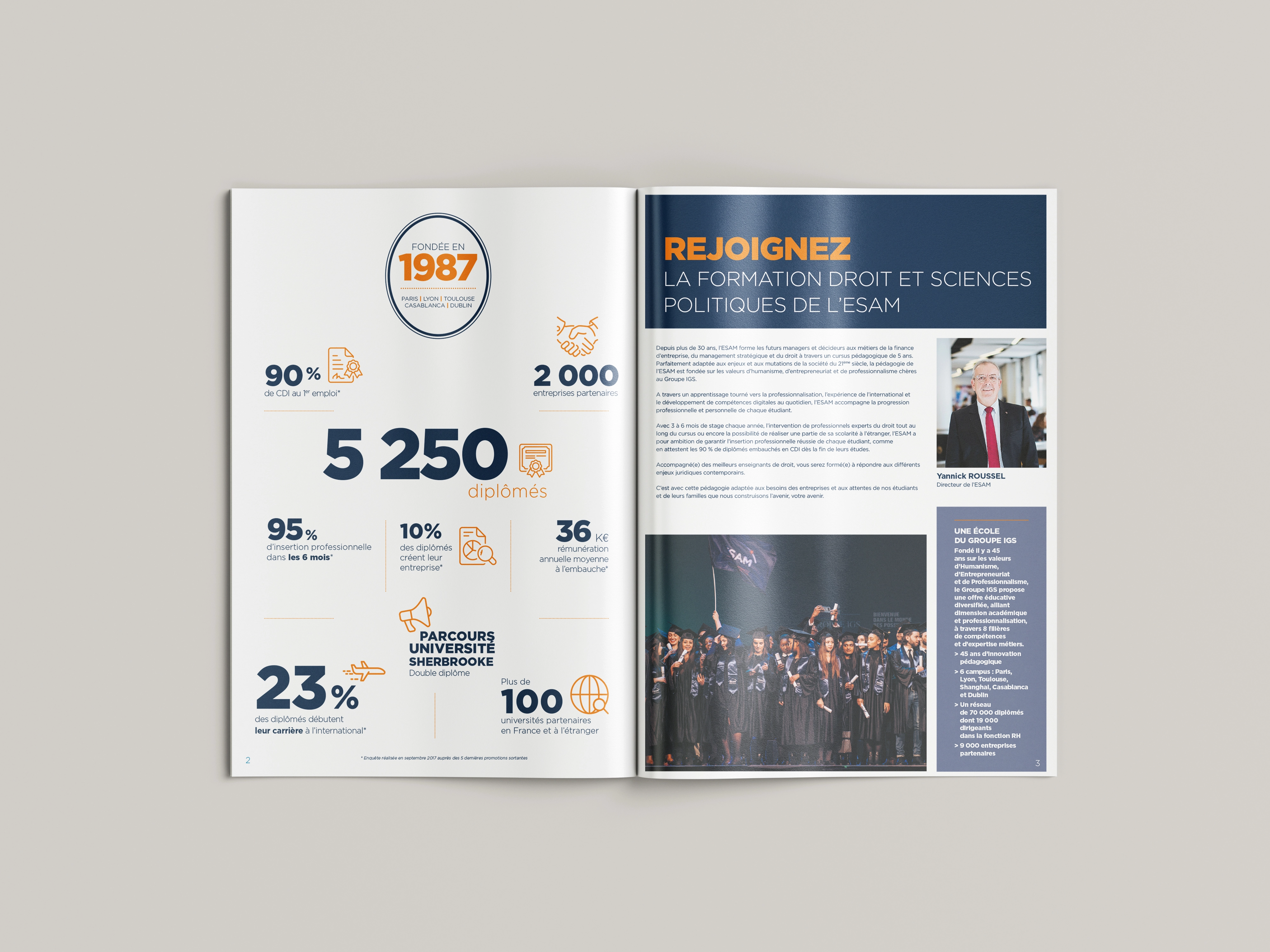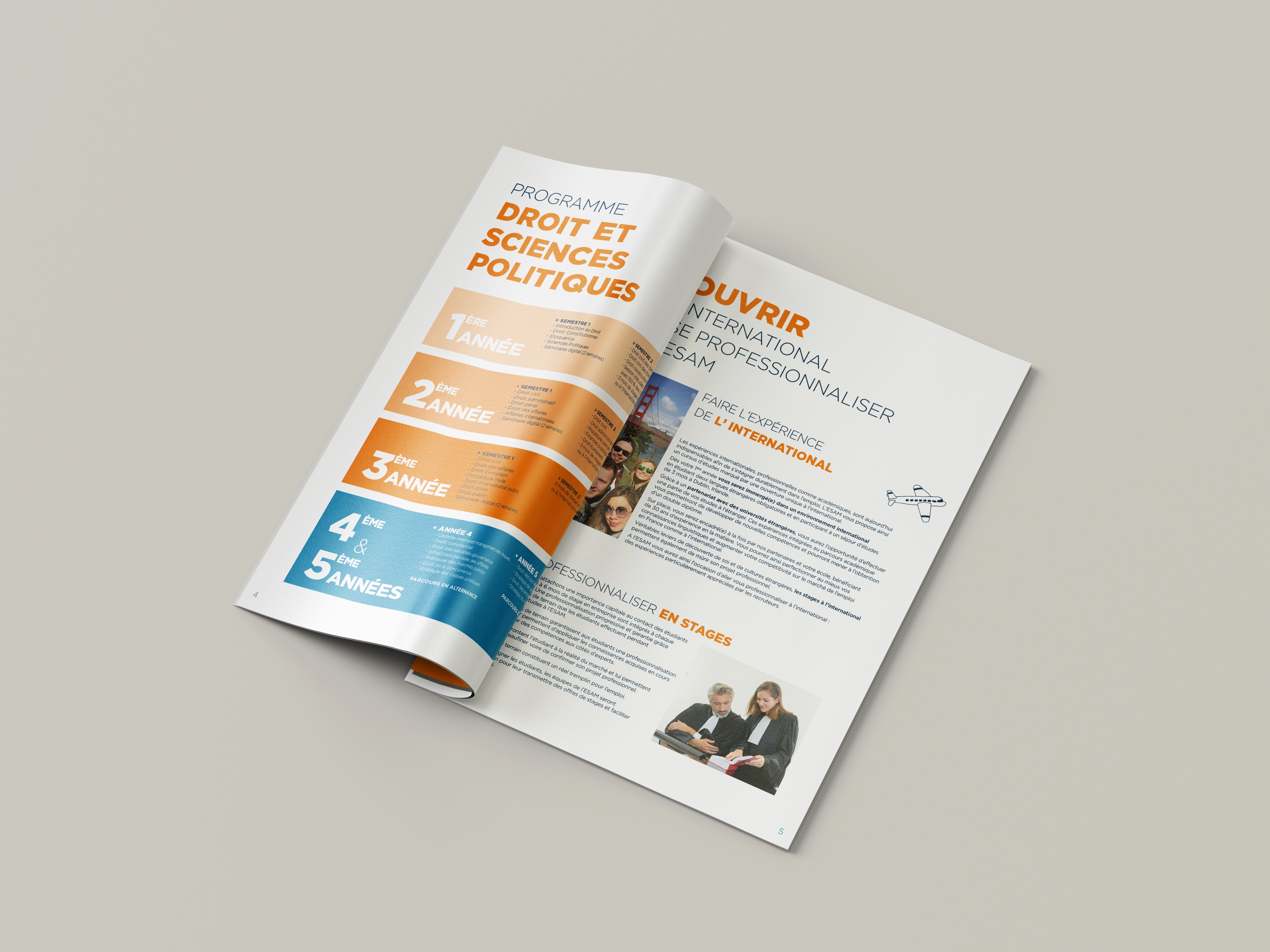 J’ai réalisé la brochure pour le programme Droit et Sciences Politiques de l’ESAM, école du Groupe IGS. L’objectif était de mettre en avant cette formation prestigieuse, en soulignant son impact sur le monde politique et en décrivant un parcours riche en expériences et aux bases solides. Le design a été pensé pour refléter le sérieux et l’excellence de l’école, tout en restant accessible et engageant pour les futurs étudiants. Chaque section de la brochure a été soigneusement structurée pour présenter les atouts de la formation, les débouchés professionnels et les témoignages des diplômés.