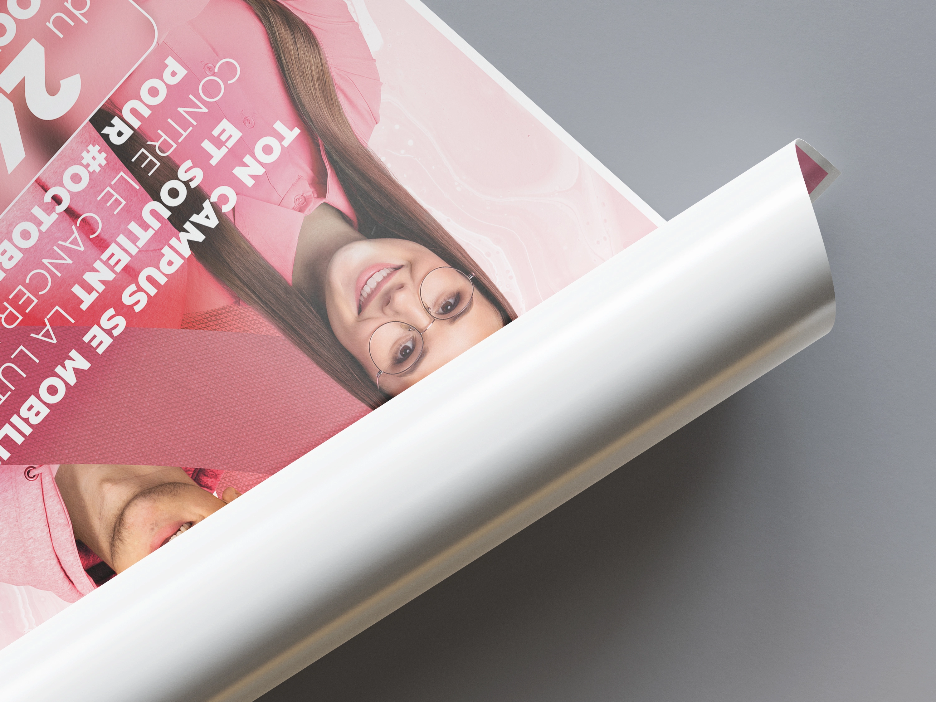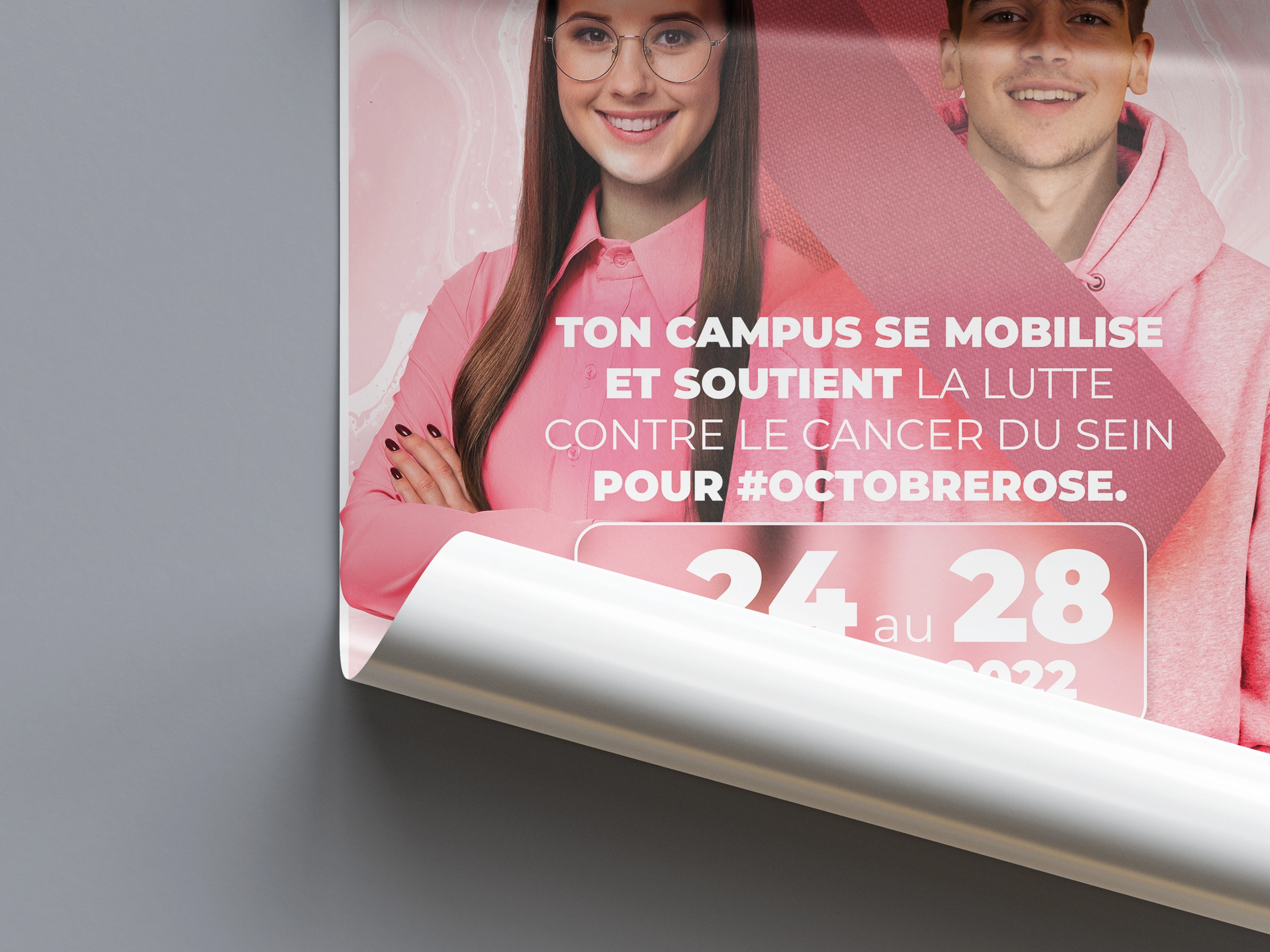 L'affiche invitait les étudiants à porter une touche de rose durant la semaine concernée, en signe de soutien à la cause. La direction artistique était totalement libre, et j'ai collaboré avec Chris Dorival (https://cbpnetwork.fr/) pour définir le message à transmettre. Nous avons travaillé de concert sur le wording, le choix des visuels, et la composition globale de l'affiche.