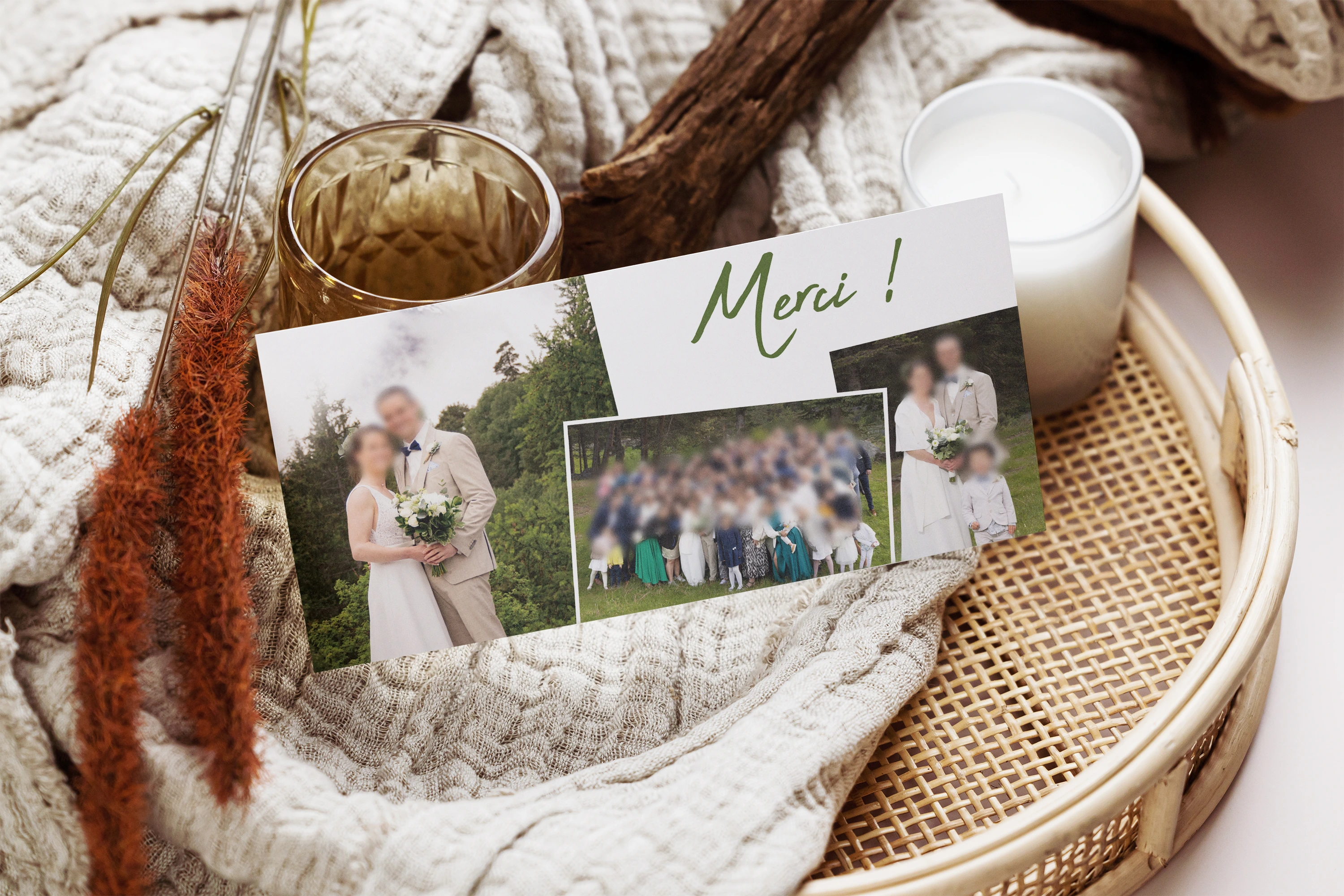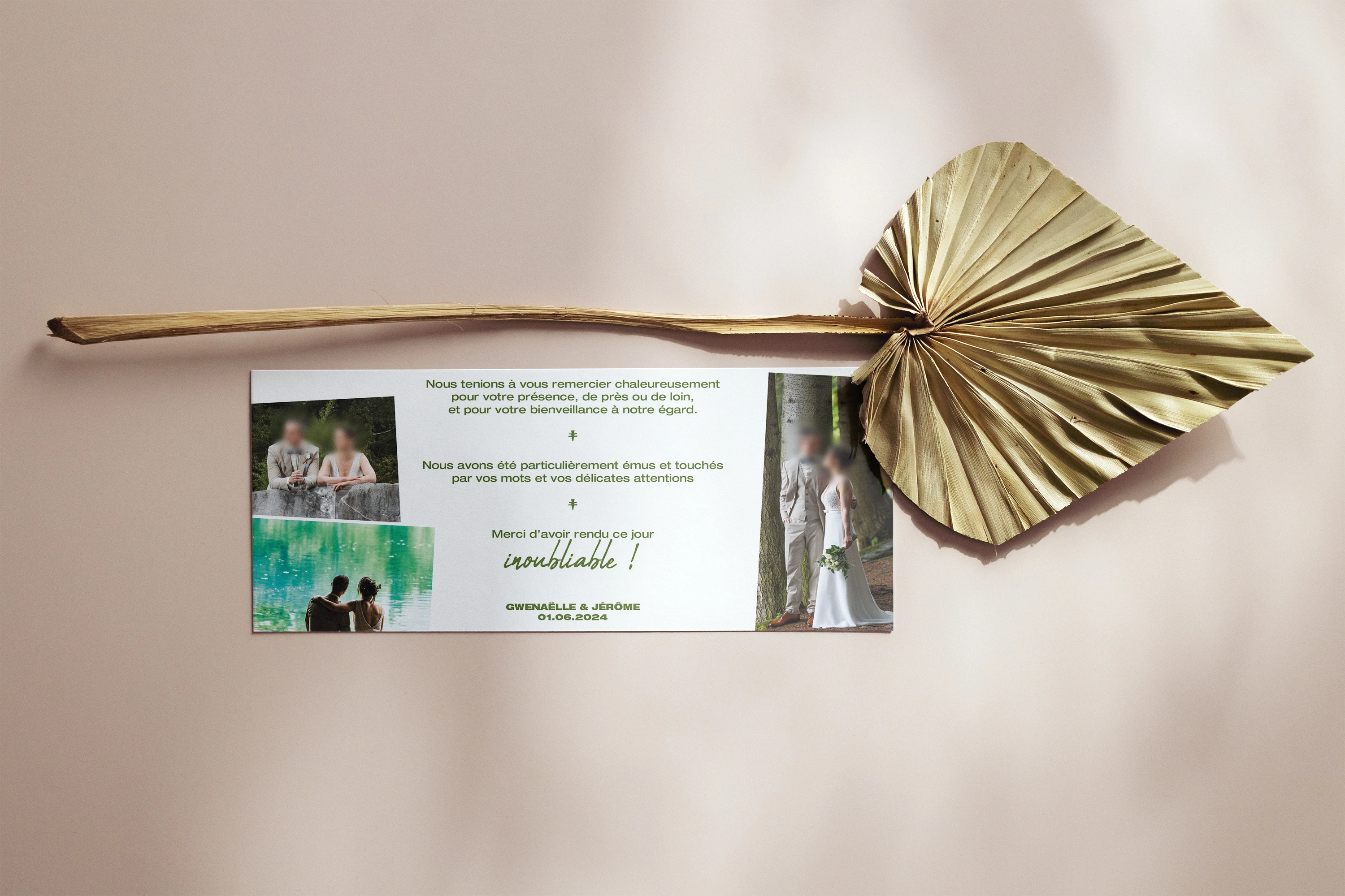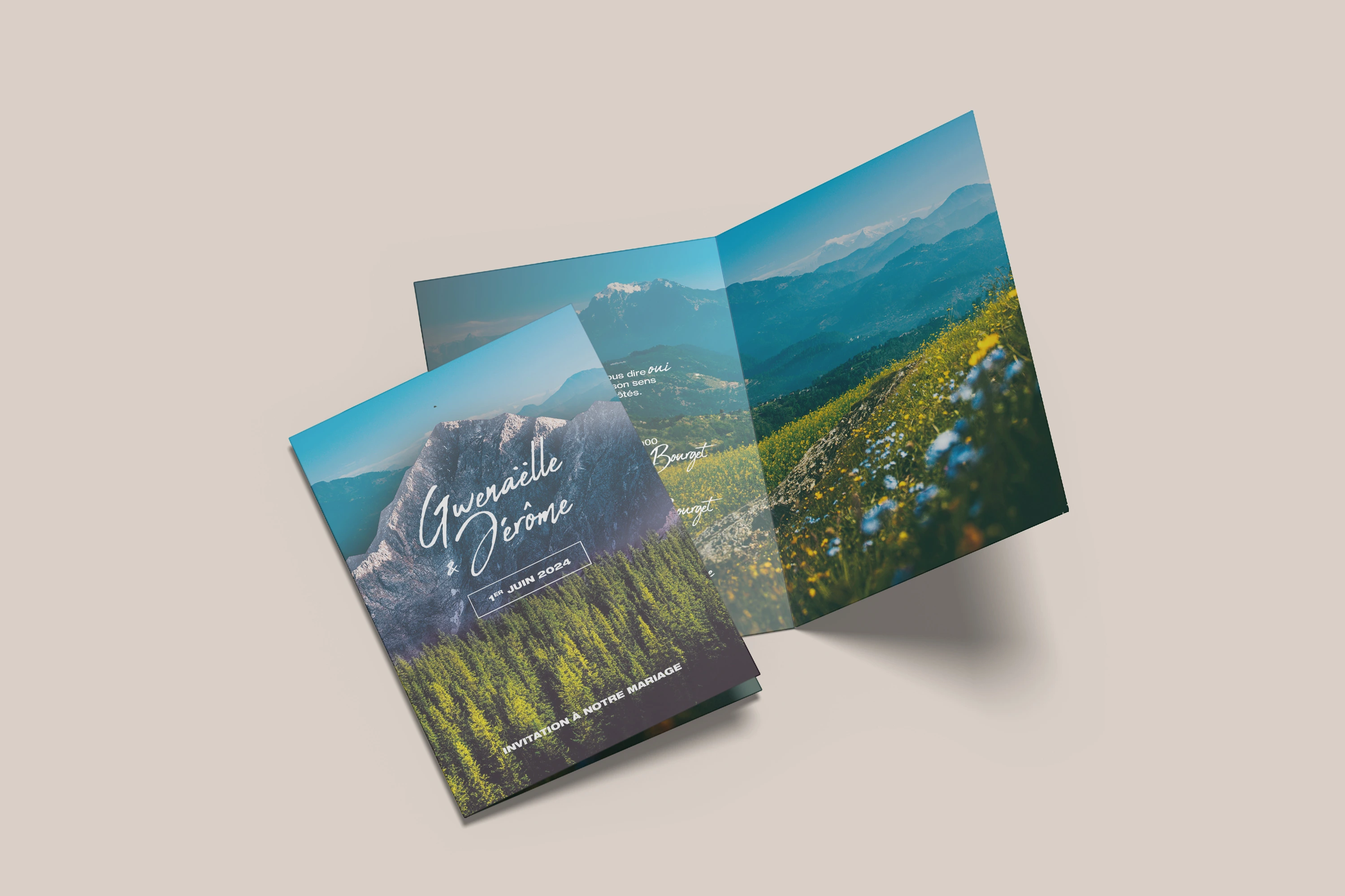 Gwenaëlle et Jérôme m’ont sollicité pour les accompagner dans la réalisation de leurs invitations et cartes de remerciement pour leur mariage. Leur univers, calme et inspiré par la montagne, a guidé mes choix créatifs : des couleurs douces en harmonie avec la nature, deux typographies soigneusement sélectionnées (dont une manuscrite pour une touche personnelle), et un magnifique paysage montagneux et arboré en fond. Pour couronner le tout, l’imprimeur a joué le jeu en réalisant une découpe en forme de montagne sur le faire-part, ajoutant une touche unique et mémorable à l’ensemble.