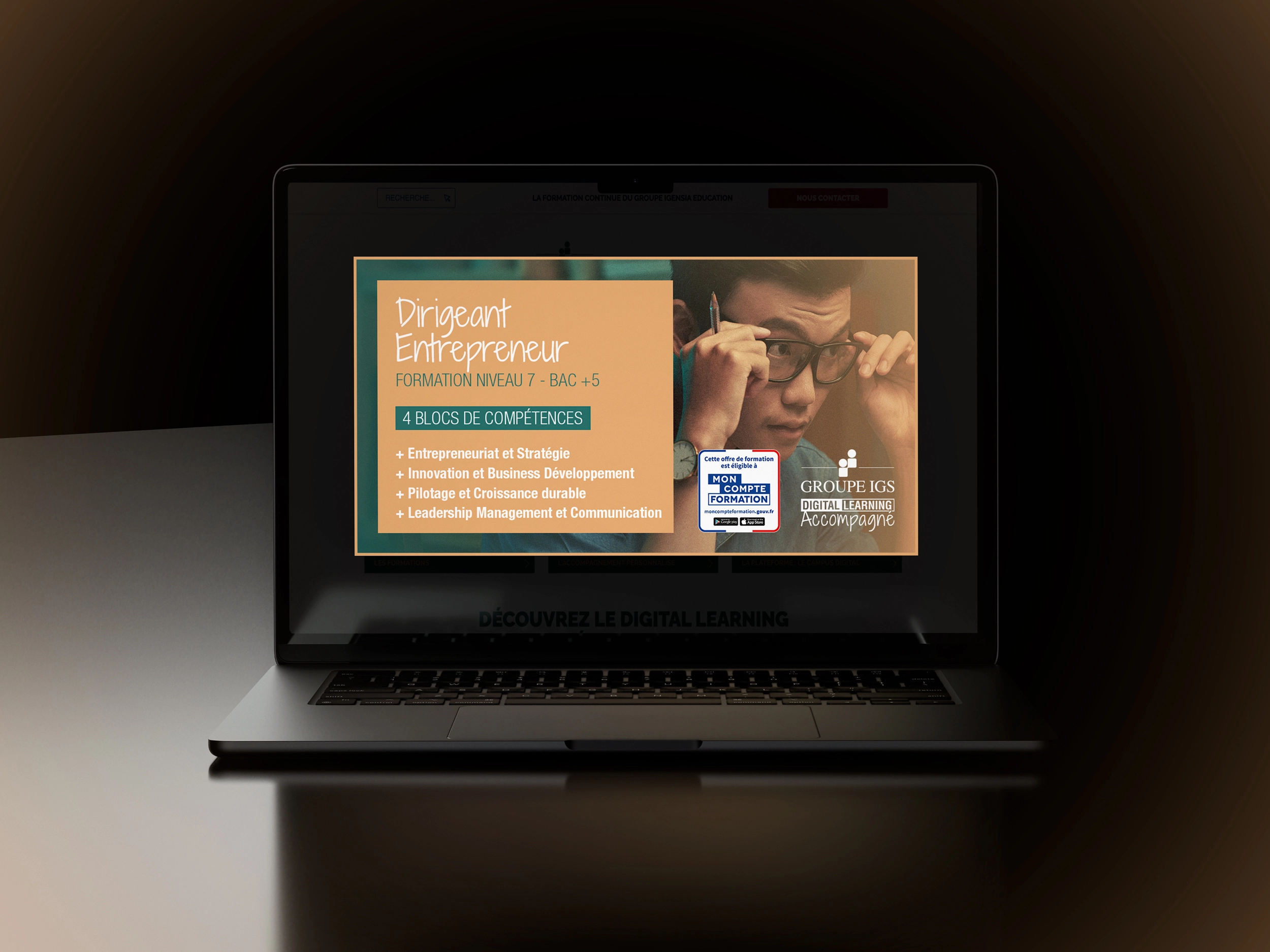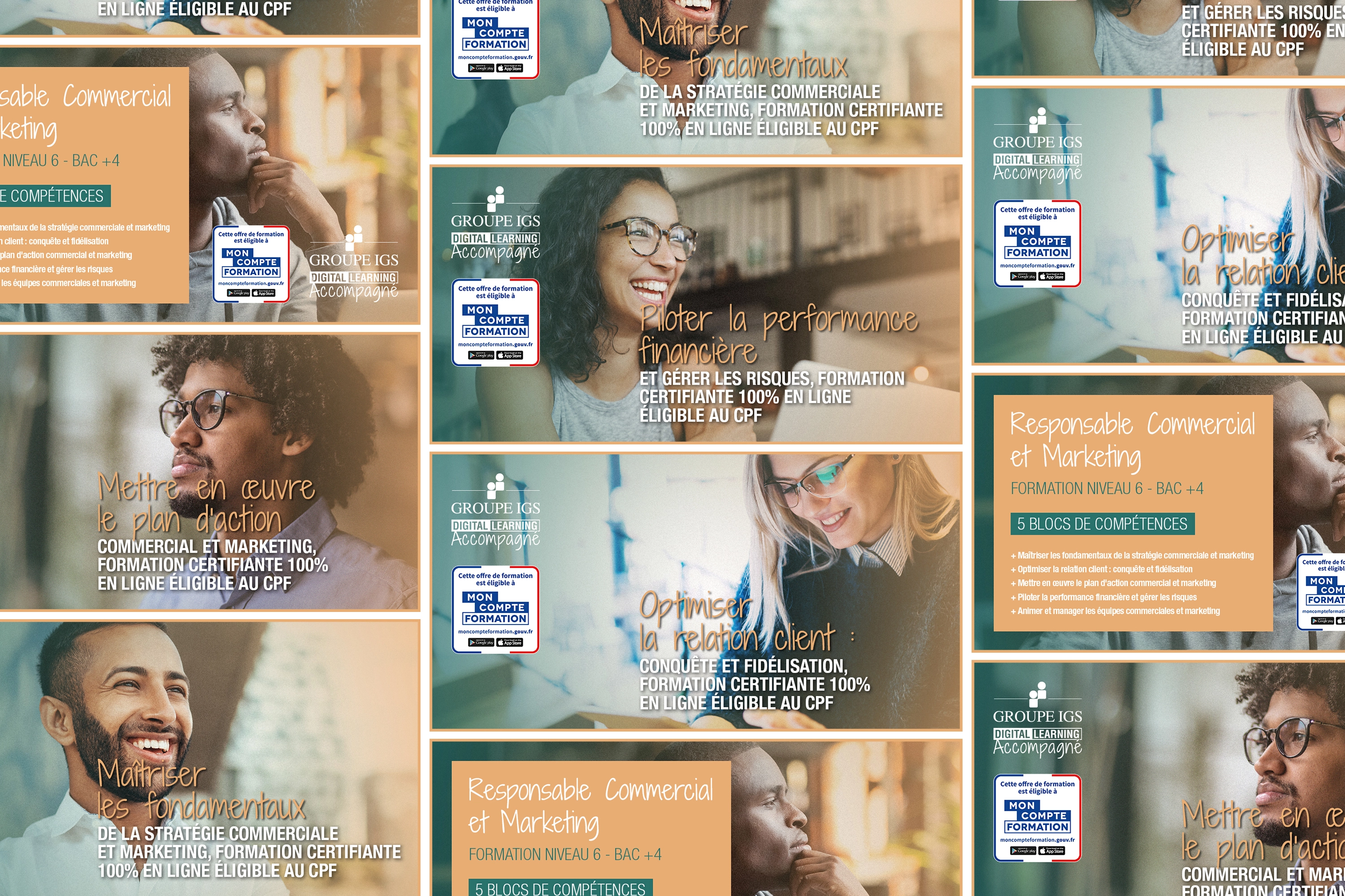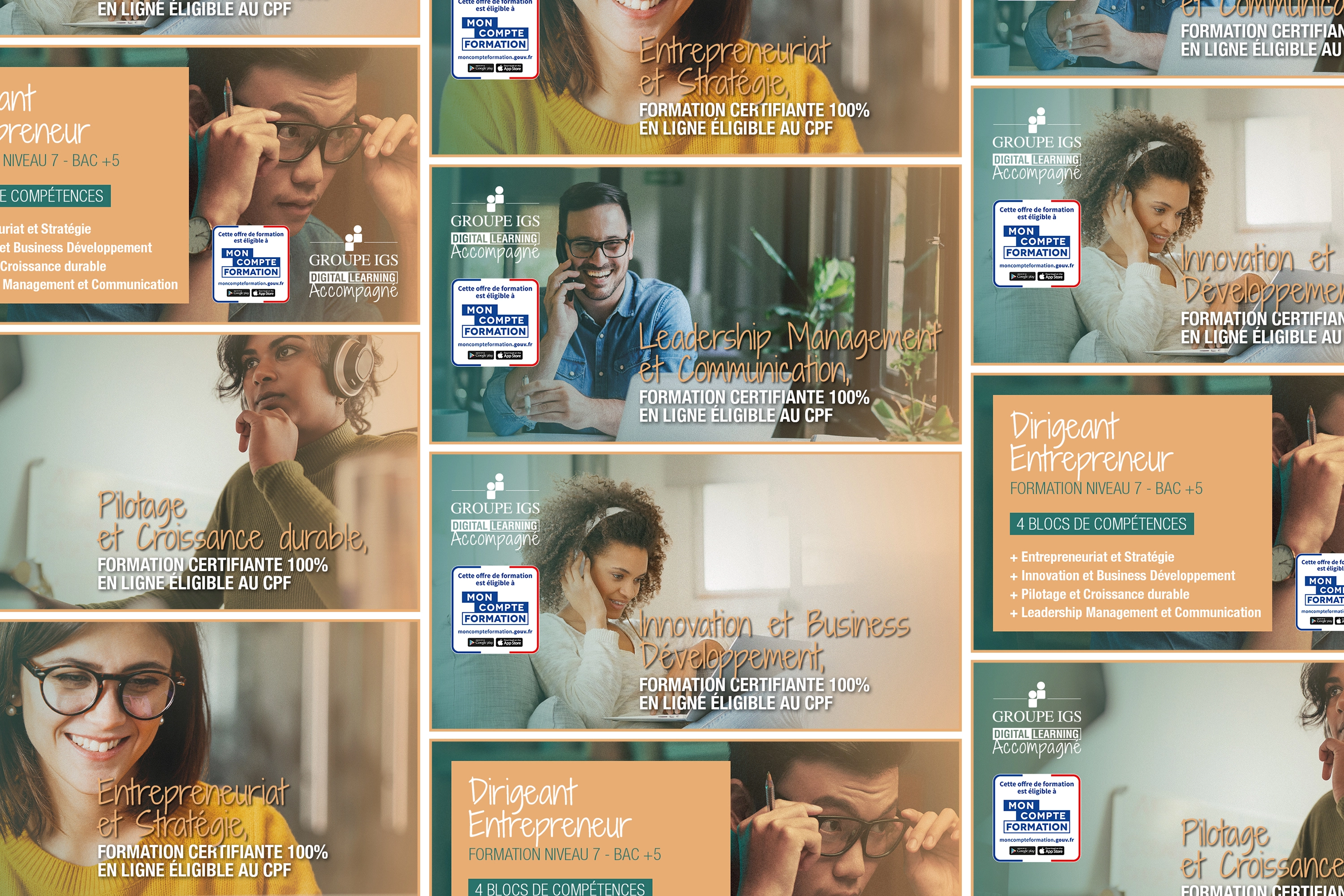 J’ai créé et réalisé les visuels réseaux sociaux pour le programme Digital Learning Accompagné du Groupe IGS. Ce campus 100% digital permet aux apprenants de construire leur parcours à la carte, en combinant flexibilité et accompagnement personnalisé. Les visuels présentent les différents parcours disponibles, en mettant en avant les blocs obligatoires et les options pour guider les futurs étudiants dans leurs choix. Le design est moderne, dynamique et intuitif, reflétant l’innovation et l’accessibilité de ce programme unique.