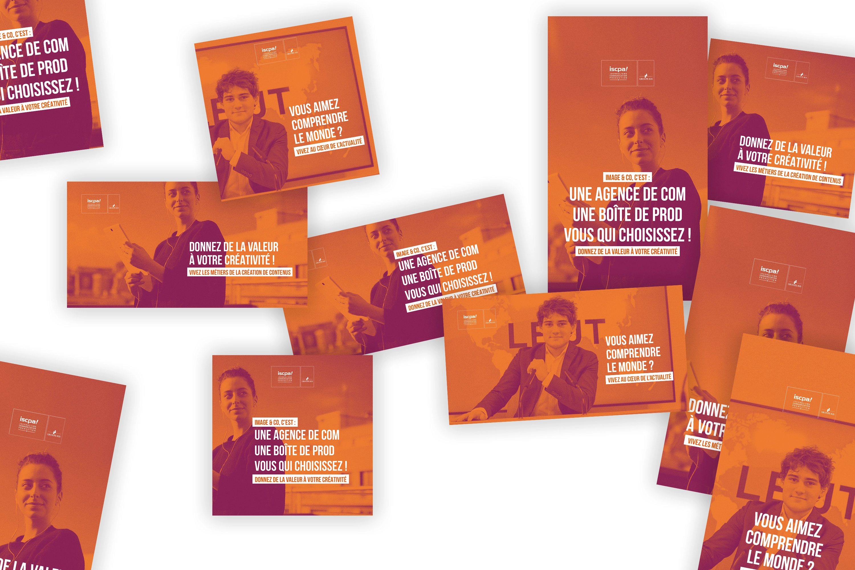 J’ai créé et décliné une série de visuels pour les réseaux sociaux pour l’école ISCPA du Groupe IGS et son programme Image & Co. Ce programme est centré sur la création de contenu (en ligne ou télévisuel) jusqu’au marketing. Les visuels ont été conçus pour mettre en avant la diversité des compétences enseignées, les débouchés professionnels et l’esprit créatif du programme. Le ton est dynamique et inspirant, avec des designs modernes et percutants pour capter l’attention des futurs étudiants et les inciter à rejoindre cette formation unique.