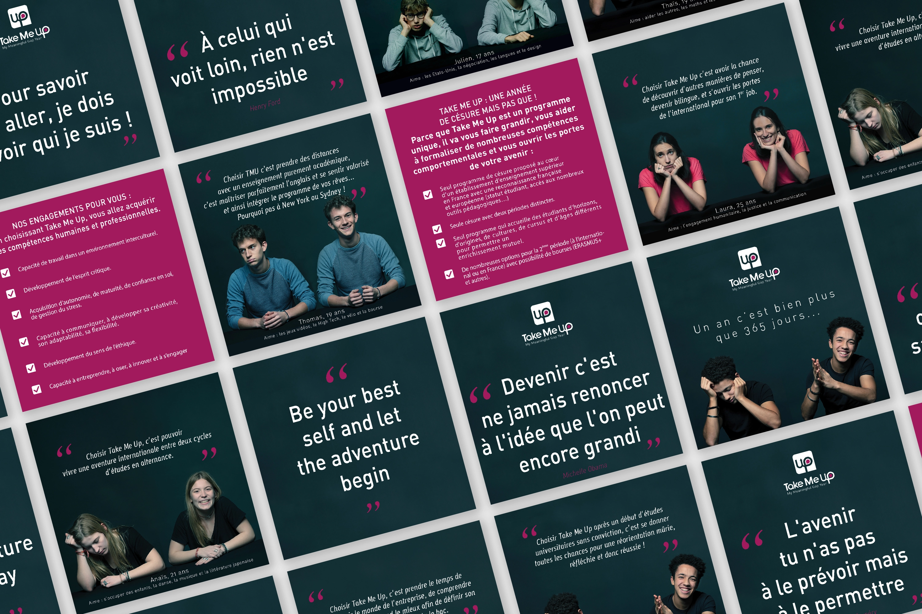 J’ai réalisé des visuels pour Facebook et Instagram pour le programme TMU (Take Me Up) du Groupe IGS. Ce programme offre à des jeunes, quel que soit leur âge, leur nationalité ou leurs talents, l’opportunité de s’épanouir et de vivre une aventure humaine et internationale unique. Les visuels ont été conçus pour refléter la diversité, la dynamique et l’ouverture d’esprit du programme, en mettant en avant des témoignages inspirants, des destinations internationales et des moments forts de l’expérience TMU. Le ton est à la fois motivant et engagé, pour inciter les jeunes à se lancer dans cette aventure.